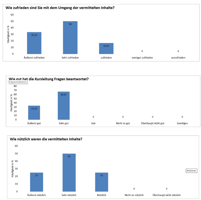 93,3% schätzten es sehr, dass alle ihre Fragen beantwortet wurden und 80% fanden die fachliche Kompetenz sehr gut.